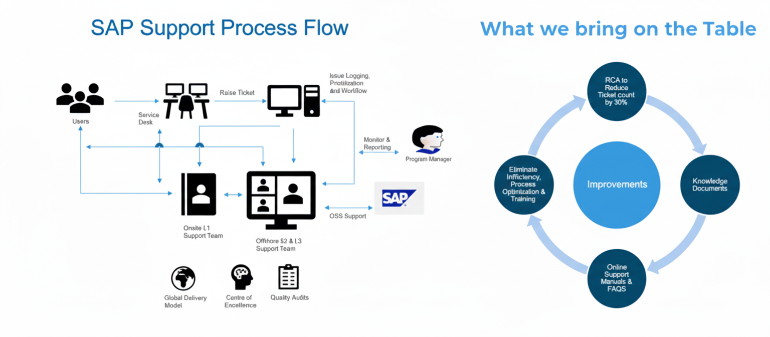 End-to-end support services including incident management, performance tuning, system monitoring, and functional enhancements—enabling clients to maintain system stability and business continuity.